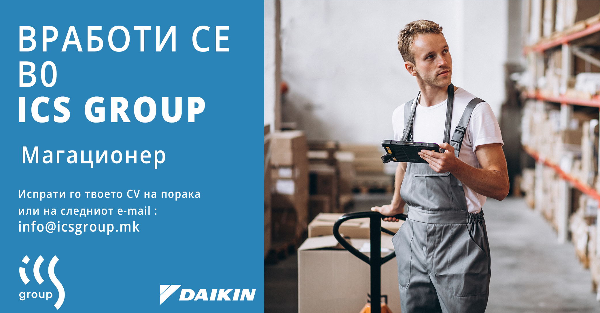 ИЦС ГРУП ДОО – Скопје e приватна компанија,овластен партнер на Јапонскиот бренд DAIKIN за Македонија, специјализирана за проектирање, продажба и изведба на системи за греење, ладење, климатизација и вентилација. Во моментов поради проширување на тимот во магацинското работење имаме потреба од спремен и одговорен профил за работната позиција: