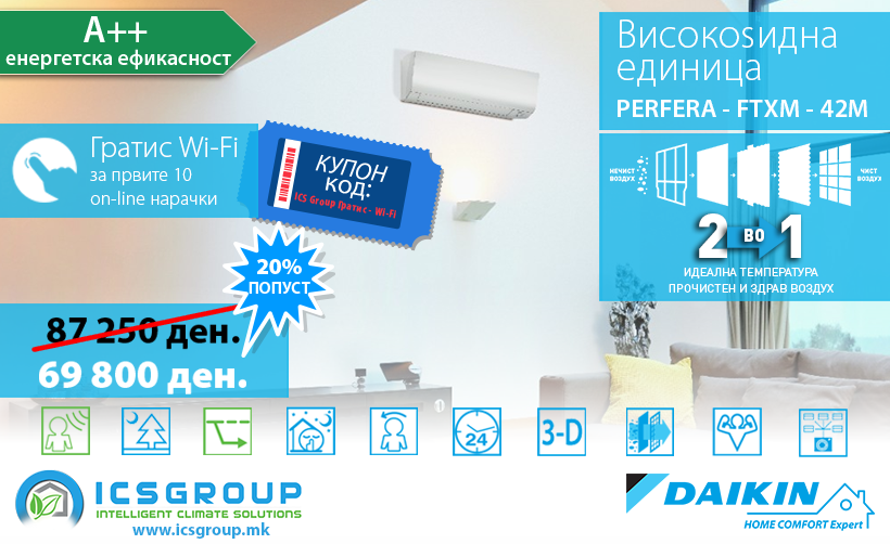 • Купонот за Гратис – Wi-Fi контрола важи само за клима уредот: DAIKIN PERFERA FTXM-42M (R-32) која е со попуст од 20% со одбрани опции (вклучена монтажа и вклучена wi-fi контрола со вкупна цена од 78.900 ден).