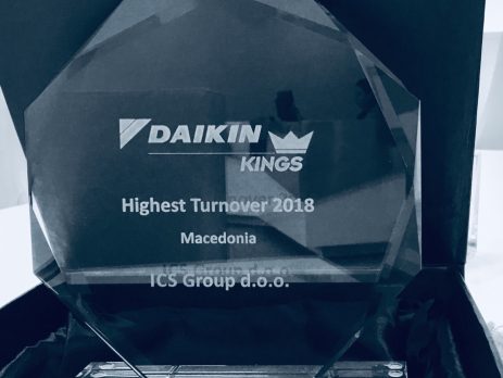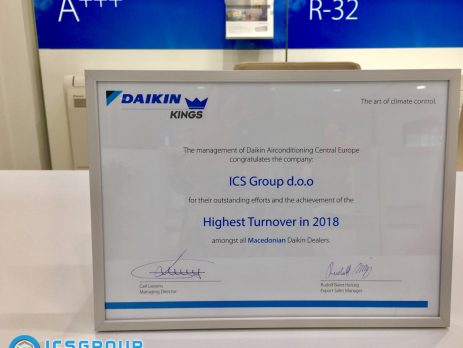 Горди сме што другите ја забележаа нашата работа и мисија во изминатата 2018 година.ИЦС ГРУП го доби новиот Сертификат “Daikin HIGHEST TURNOVER 2018“ за постигнат најголем успех, од сите дилери на Daikin во Македонија.Благодарност до сите кои ни ја дадоа својата доверба и веруваат во нас! Професионалниот тим на ИЦС ГРУП може да одговори на сите предизвици во областа на Daikin HVAC системите! ИЦС ГРУП – HCE PREMIUM Partner на DAIKIN за Македонија.