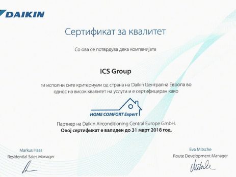 ИЦС ГРУП за својот професионализам во работењето, исполнителност и висок степен на задоволни корисници при продажба и инсталирање на ДАИКИН производите, ја доби престижната награда” Highest Customer Satisfaction 2017 ”на годишната DAIKIN International Partner Conference 2018, одржана на 26.04. во Аlpbach, Avstrija.